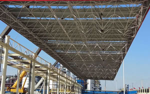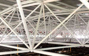 干煤棚網架主要搭建機構為平面剛架、平面桁架、平面拱以及柱面網殼結構。
